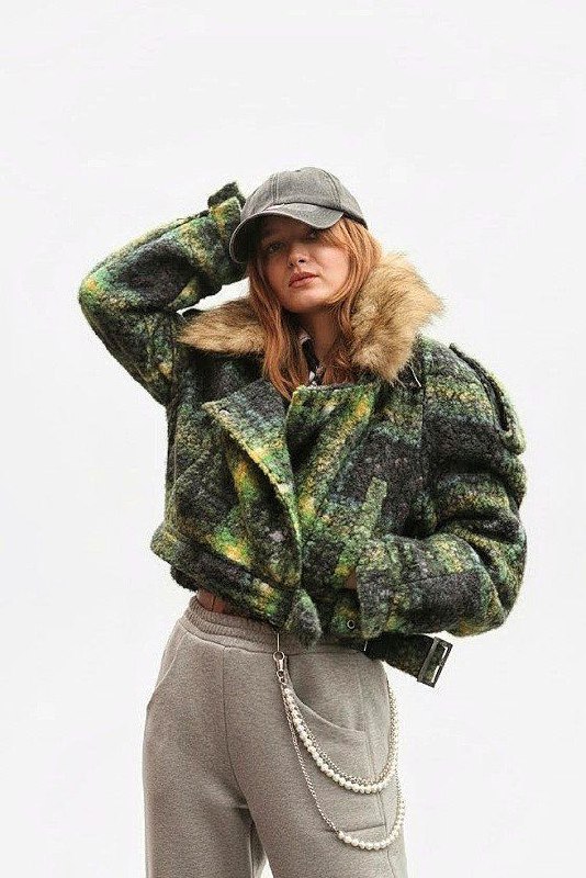 В комплекте: сьемный меховой воротник, украшение в виде цепочки, булавки.